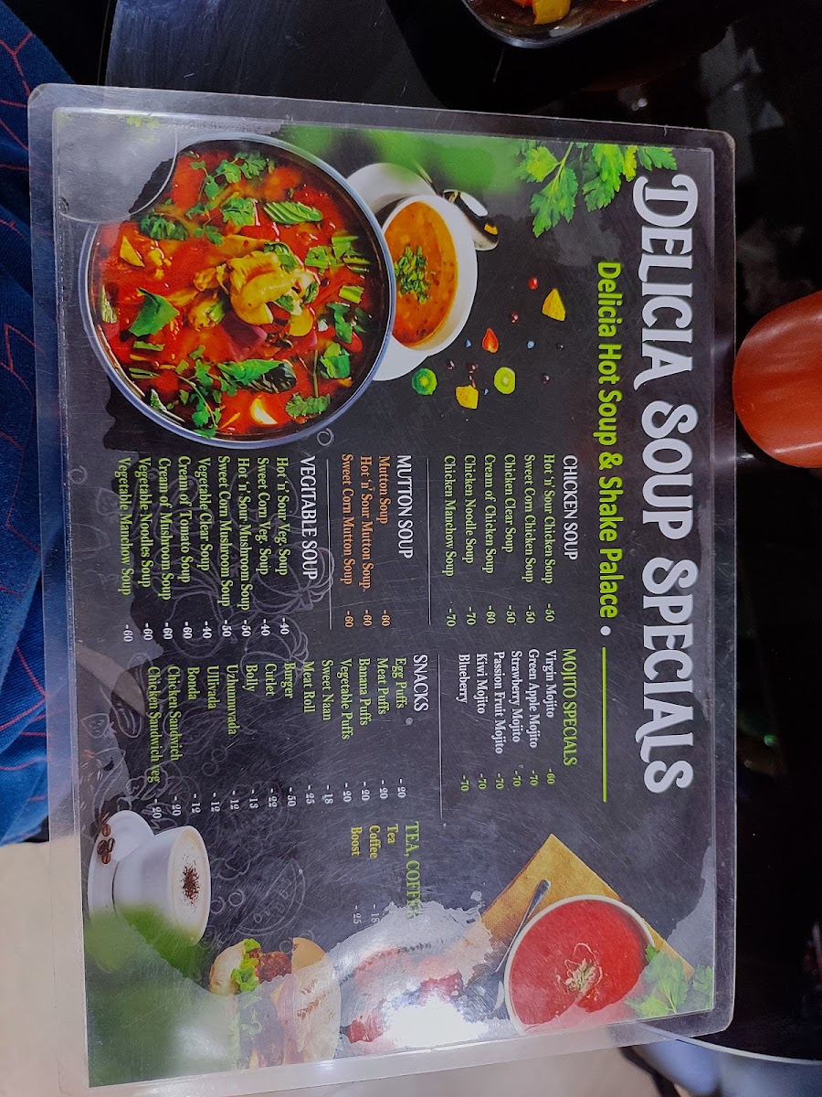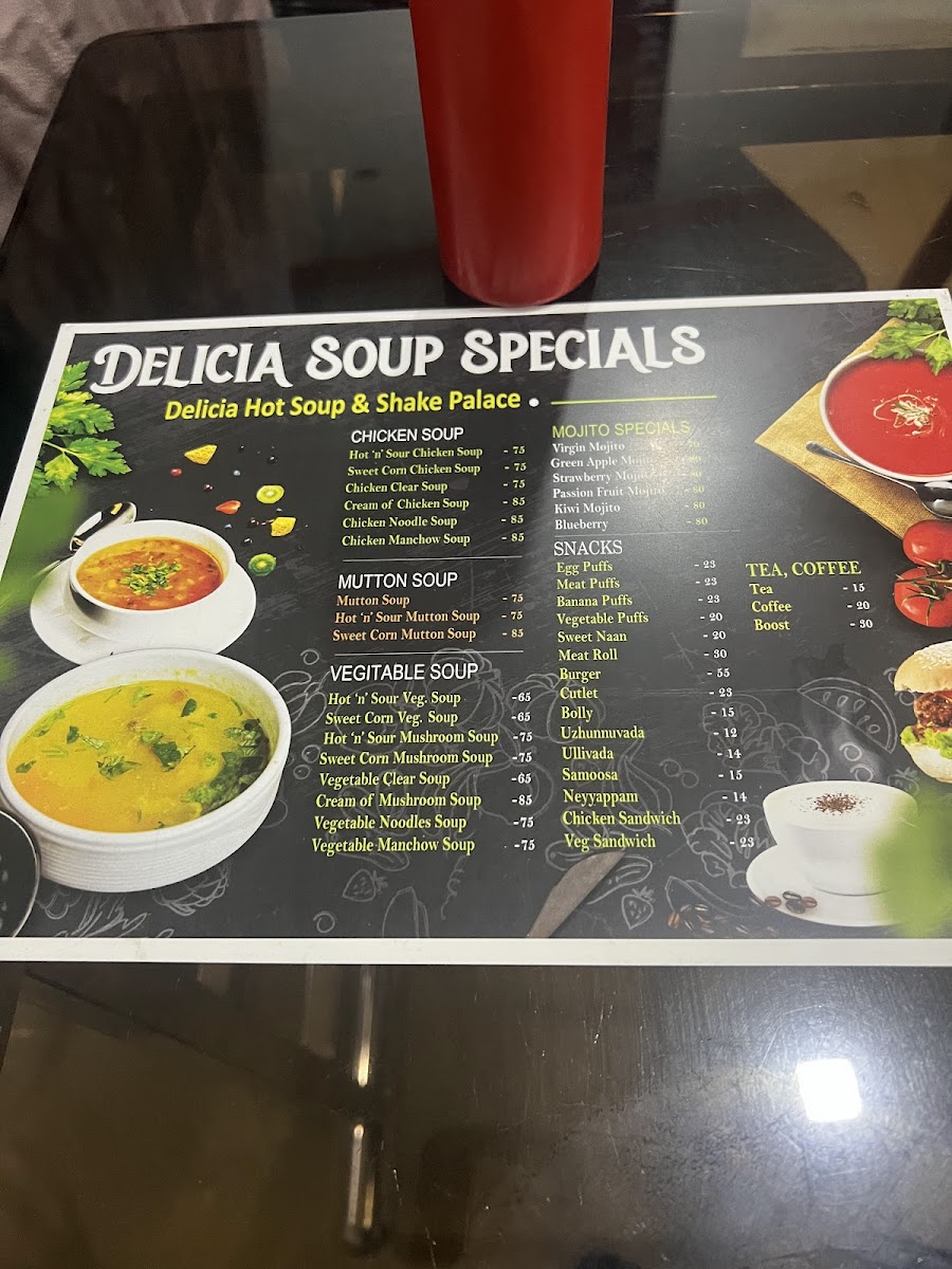 Welcome to DELICIA Soups & Shake Palace, a cozy café located in the heart of Pala, Kerala, renowned for its diverse and delectable menu. As you step in, the aroma of rich mutton soups beckons you to indulge. Their standout offerings include the Hot 'N' Sour Mutton Soup and Sweet Corn Mutton Soup, each brimming with bold flavors and hearty chunks of mutton, perfectly spiced to tantalize your taste buds.